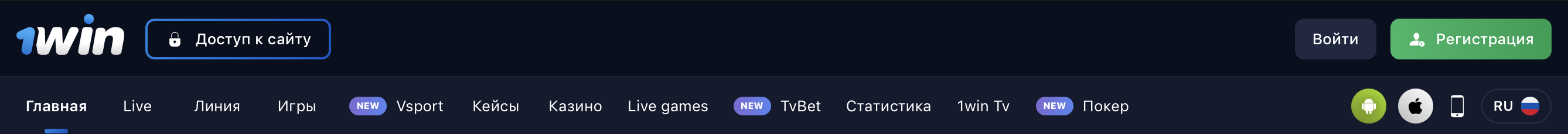 Официальный ресурс букмекерской конторы 1Вин привлекает ярким тематическим оформлением, широким функционалом и простым, удобным в пользовании интерфейсом. В главном меню, находящемся над сайдбаром в шапке сайте, собраны следующие разделы: